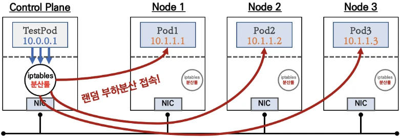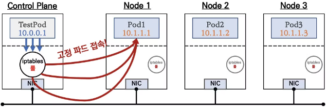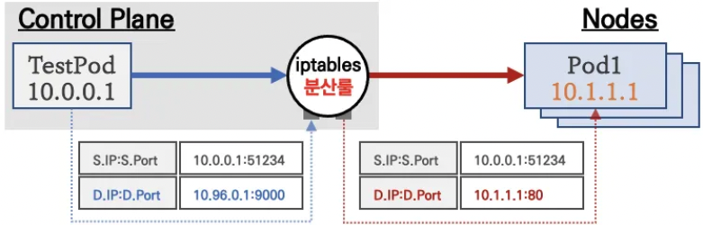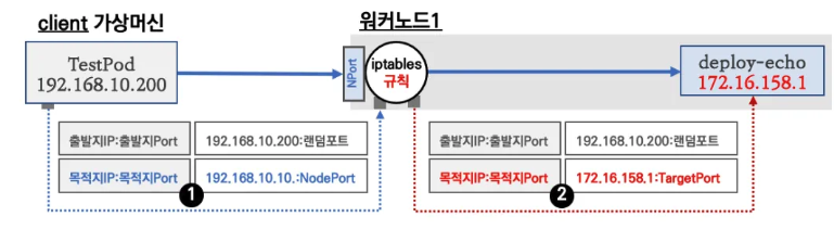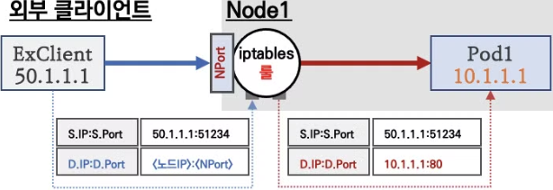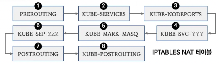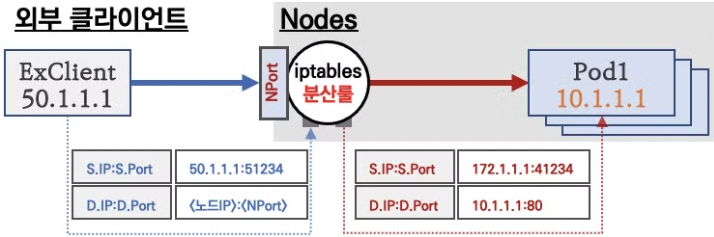 [2] 노드에 iptables NAT 테이블 규칙과 매핑되어 목적지 IP와 목적지 Ports는 변환되지만 출발지 IP와 Port는 변환되지 않고 목적지 파드에 전달된다. (파드 입장에서 클라이언트 ip가 그대로 존재)
