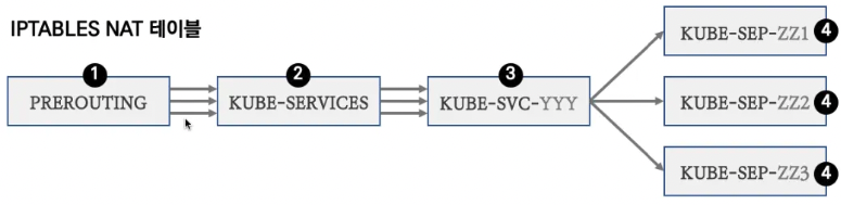# KUBE-SVC-# 이후 과정은 Cluster-IP 와 동일! : 3개의 파드로 DNAT 되어서 전달