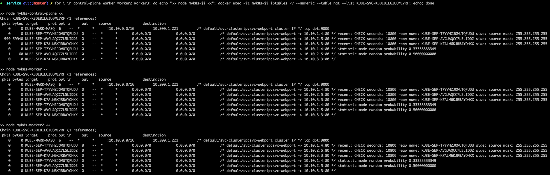 for i in control-plane worker worker2 worker3; do echo ">> node myk8s-$i <<"; docker exec -it myk8s-$i iptables -t nat -S | grep KUBE-NODEPORTS | grep $NPORT; echo; done