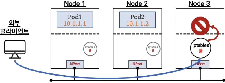externalTrafficPolicy 설정은 다른 노드에 배포된 파드로는 접속되지 않는다.